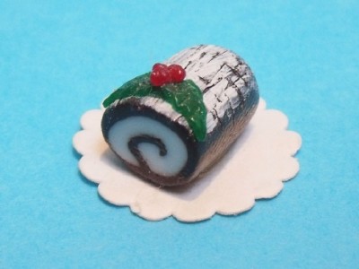 Dolls Christmas food, Yule log on a doilly – Collectors Item. Not suitable for young children.