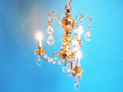 Dolls house miniature Crystal Chandelier. In a beautiful gold finish, three candle with real crystal droplets. 12 volt replaceable real looking candle bulbs.