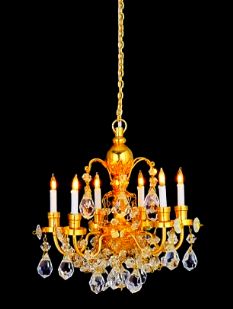 A dolls house miniature beautiful crystal chandelier, gold finish, six candle with real crystal droplets.12 volt replaceable real looking candle bulbs. Spare bulbs always available.
