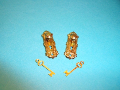 ONE PAIR (for one door both sides) VICTORIAN DOOR KNOBS & FANCY DOOR PLATES COMPLETE WITH BRASS. KEYS.