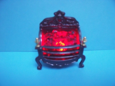 Dolls house Georgian fire grate with coals, metal body, black finish with brass finials. Complete with 12 volt fire bulb on wires.