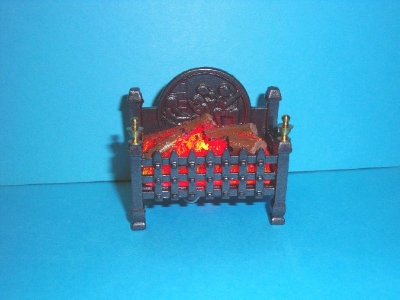 Dolls house Georgian fire grate with glowing logs, black metal & brass finials complete with 12 volt red fire bulb on wires.