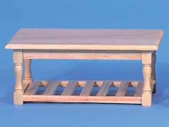 DOLLS HOUSE KITCHEN WORK TABLE IN PINE FINISH WITH SLATTED BOTTOM SHELF FOR UTENSILS, POTS AND PANS ETC: – –