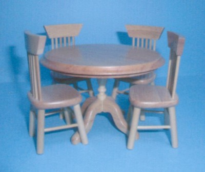 DOLLS HOUSE ROUND KITCHEN TABLE AND 4 CHAIRS IN PINE FINISH.