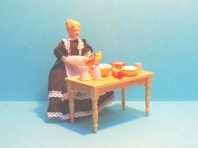 DOLLS HOUSE KITCHEN TABLE ONLY (RECTANGULAR) IN PINE FINISH. DOLL AND ALL OTHER ACCESSORIES ARE FOR ILLUSTRATION PURPOSES ONLY AND ARE NOT INCLUDED.
