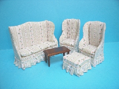 A DOLLS HOUSE 5 PCE LIVING ROOM SET IN WHITE WITH GREEN / PINK FLORAL DESIGN, – COMPRISES – SOFA, TWO CHAIRS, OTTERMAN & COFFEE TABLE.