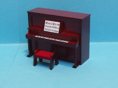 Dolls house piano [upright] finished in mahogany effect with matching red velvet stool.