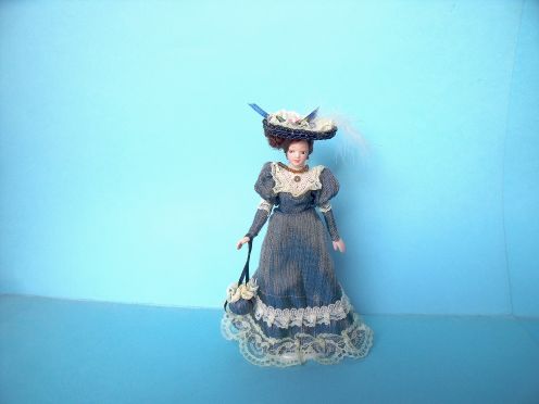 Dolls house Victorian lady in pretty dark blue dress [porcelain] 150 m/m tall, appprox. [poseable] Supplied complete with doll stand.