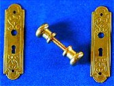Dolls house door knob & plate, Victorian, (one pair) for one door. Screw together door knobs. – Solid polished brass. Priced per pair, for one door [both sides]