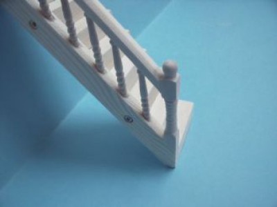 Dolls house wooden cottage stairs [unpainted] complete with bannister rail, Newels and spindles assembled ready to use, 13 treads x 50m/m wide, height – floor to floor 195m/m [7.62″ approximately]