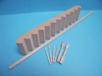 Dolls house stairway kit for small to medium sized dolls houses. Stair width 67 m/m x *210 m/m height (floor to floor) with some room for adjustment either way to this *height. – Kit comprises – MDF stairs, 12″ hand rail, 2 Newels (posts) & 12 spindles. Hand rail needs to be cut to your required length. – Need any help! – just email or phone us.